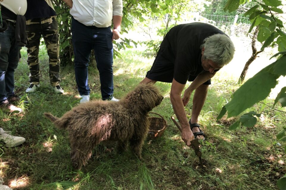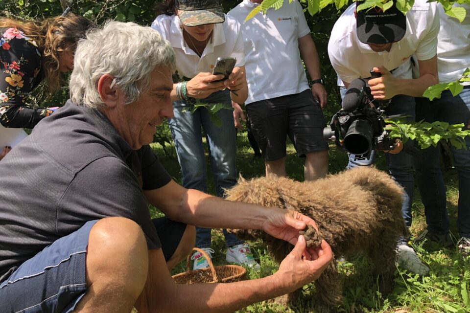 | Éric Allegret s’est prêté à une démonstration de cavage avec Neige, sa chienne de 6 ans, qui s’est révélée particulièrement efficace. (©LL/Réussir le Périgord) |